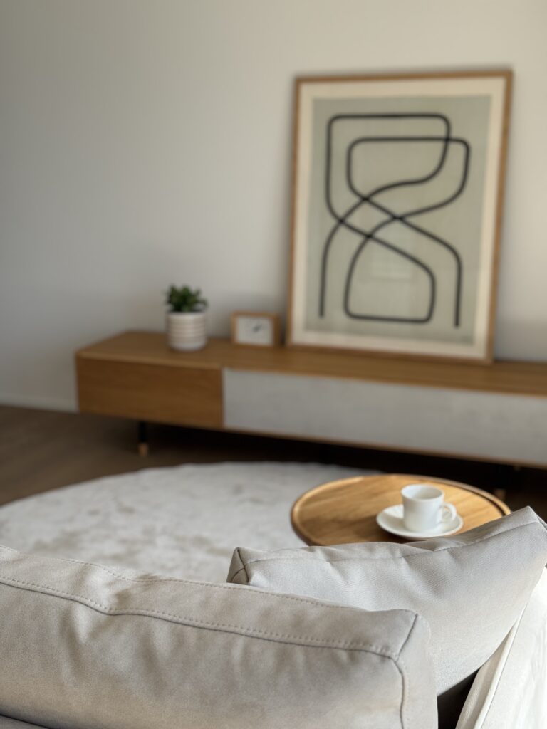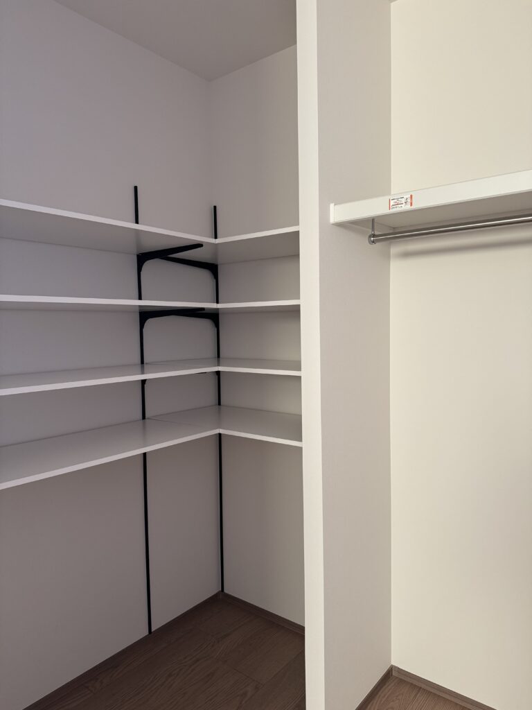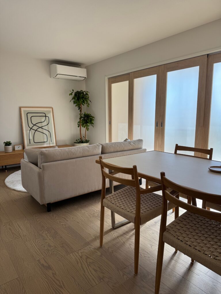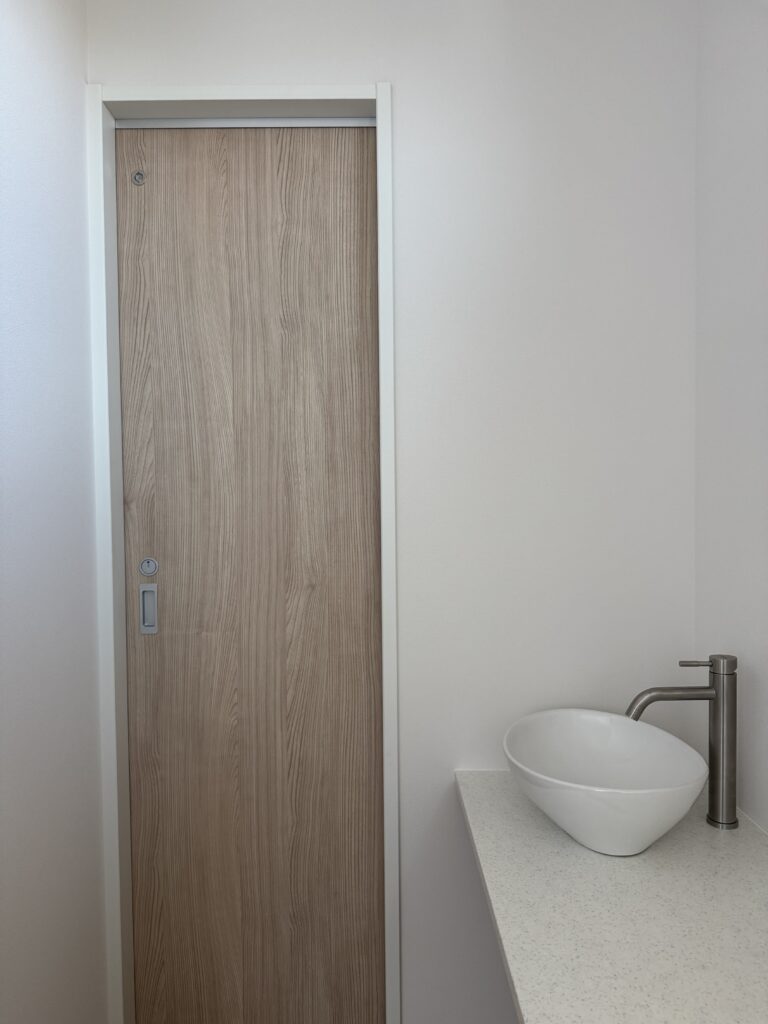 また、アクセントクロスを使わずとも心地よく整う空間に、グレージュの突板がやわらかな深みを添えています。